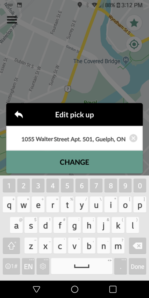 If you live in a townhouse complex, or apartment, you can include this information by placing the cursor after “Street”, in this example, and input the extra info for your driver. Once you are finished with your edit, tap “CHANGE” and then “SET PICK UP“.