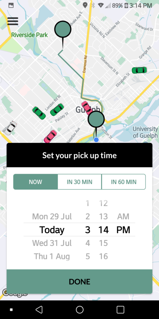 By tapping on the clock in the previous screen, you will come to this screen. Here you can set your pickup time if other than asap. You can set to be picked up on 30 minutes, an hour or choose a custom date and time. Tapping “Done” will return you to the Booking screen