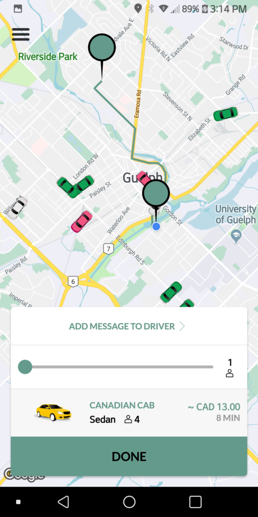 You can adjust the slider to choose how many passengers there will be, up to the capacity of the car shown under “Canadian Cab”. This is entirely optional, but please remember that we are only legally able to take as many passengers as there are seat belts for. This is set out by the Ministry of Transportation and could cost a driver his/her license if caught breaking this law.