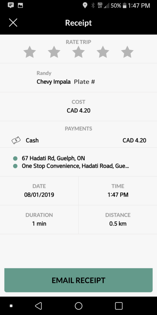 At the end of your ride, you may rate the ride by selecting the appropriate star at the top. All the trip information will be represented and you may even have a receipt emailed to you.